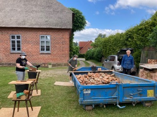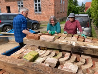 Firma Steen wurde beauftragt, die schadhaften Balken auszuwechseln. Dafür war es notwendig, die Wände zu demontieren. Das geschah und geschieht in Eigenarbeit und mit Hilfe unseres Freundeskreises. Bei der Gelegenheit werden die einzelnen Steine gesäubert und sortiert. Schadhafte und nicht originale Steine werden ausgesondert. Anschließend werden die Gefache wieder aufgemauert. Die Türen wurden entfernt und sollen rekonstruiert werden.
