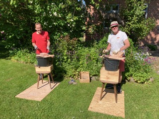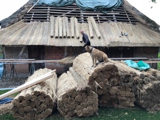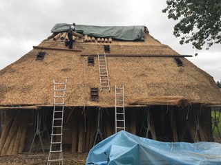 Abschließend wurde die Ostseite der Scheune mit neuem Reet eingedeckt und das Mauerwerk ausgebaut und zur weiteren Untersuchung und eventuellen Verwendung aufbewahrt. Die Wand wurde durch Spanplatten ersetzt und mit starker Plastikfolie gesichert. Mit dem neuen Dach und der provisorischen Wand war ein zufriedenstellender Zustand erreicht.