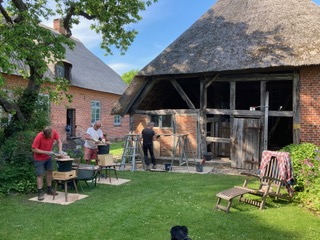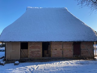 Damit ein weiterer Verfall des gesamten Gebäudes verhindert würde, musste also zunächst im Herbst 2003 die Ostseite der Scheune gerettet werden. Das Reet, das zum Teil nur noch lose auf dem Dachstuhl lag, wurde von Andrew Plumridge entfernt und abtransportiert. Die schadhaften Balken des Dachstuhls wurden von der Firma Steen, die im Ort ansässig ist, ausgewechselt und erneuert. Dabei kamen die für seit der Mitte des 18. Jahrhunderts typischen Holznägel zur Befestigung der Dachlatten und Weidebindungen für das Reet zu Tage, was eine erste Datierung auf die Entstehung des Gebäudes zuließ.